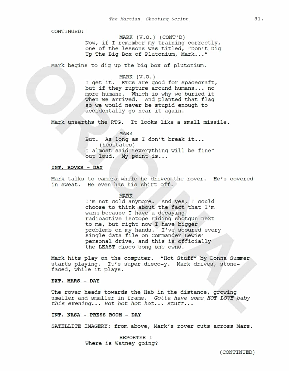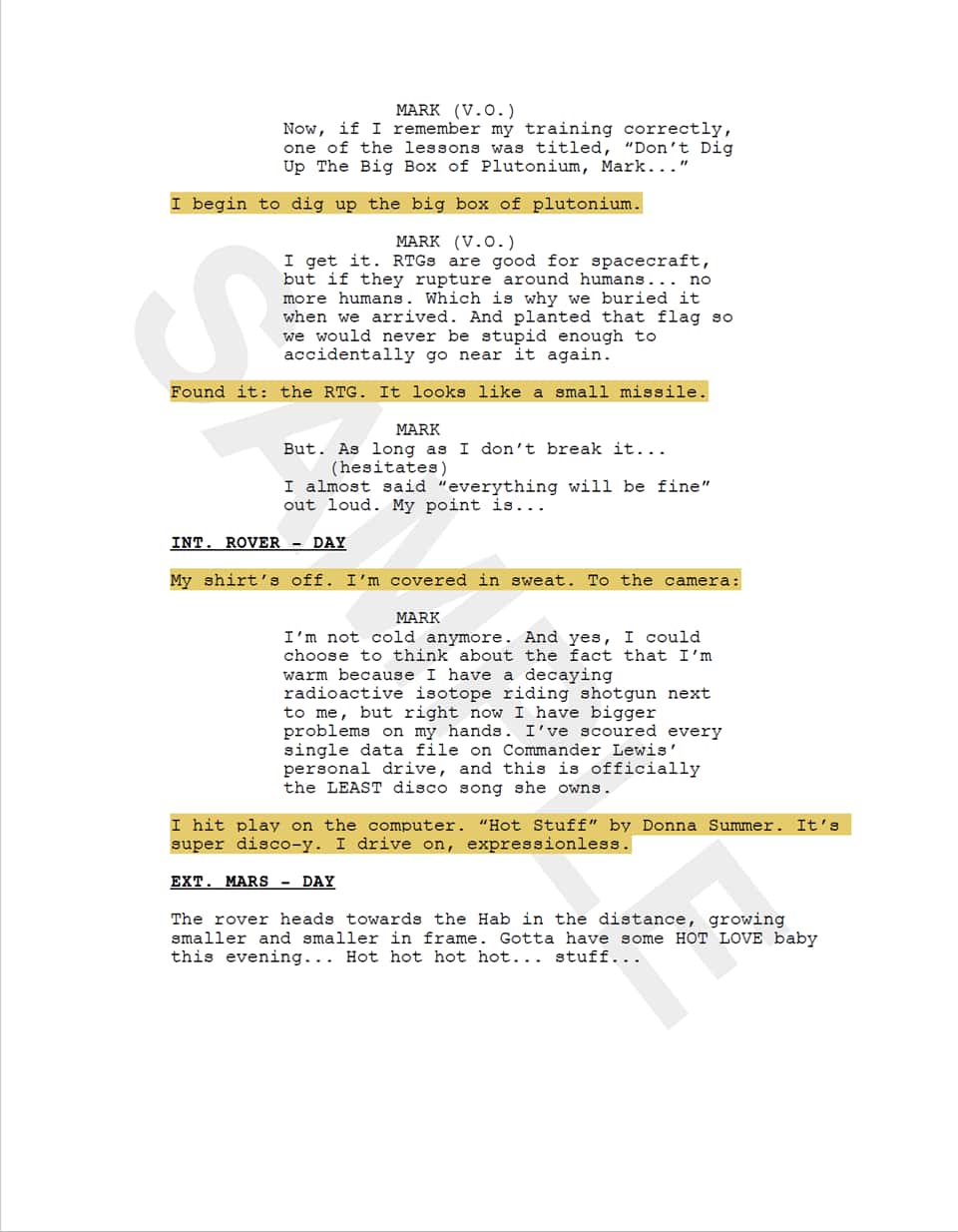 The first example (with the watermark: ORIGINAL) is page 31 of screenwriter Drew Goddard's screenplay. The second example (with the watermark: SAMPLE) is the same screenplay, however Mark Watney is telling his own story through the action blocks.
